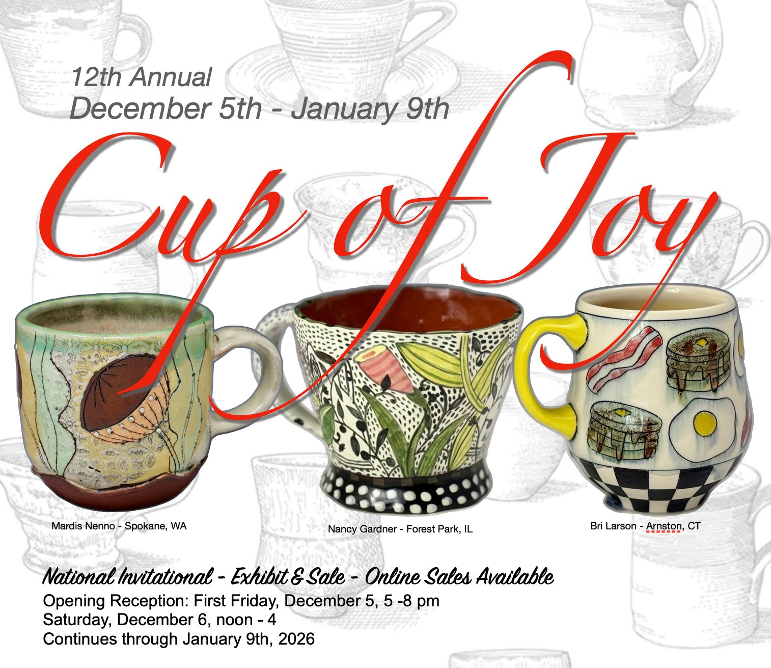 12th Annual Cup of Joy opens Friday, December 5th 5 - 8 pm. ONLINE SALES open, become visible and available for purchase Saturday, December 6th @ 8 AM. FREE SHIPPING on any purchase of $150 or more. Link to sales site - CLICK HERE.