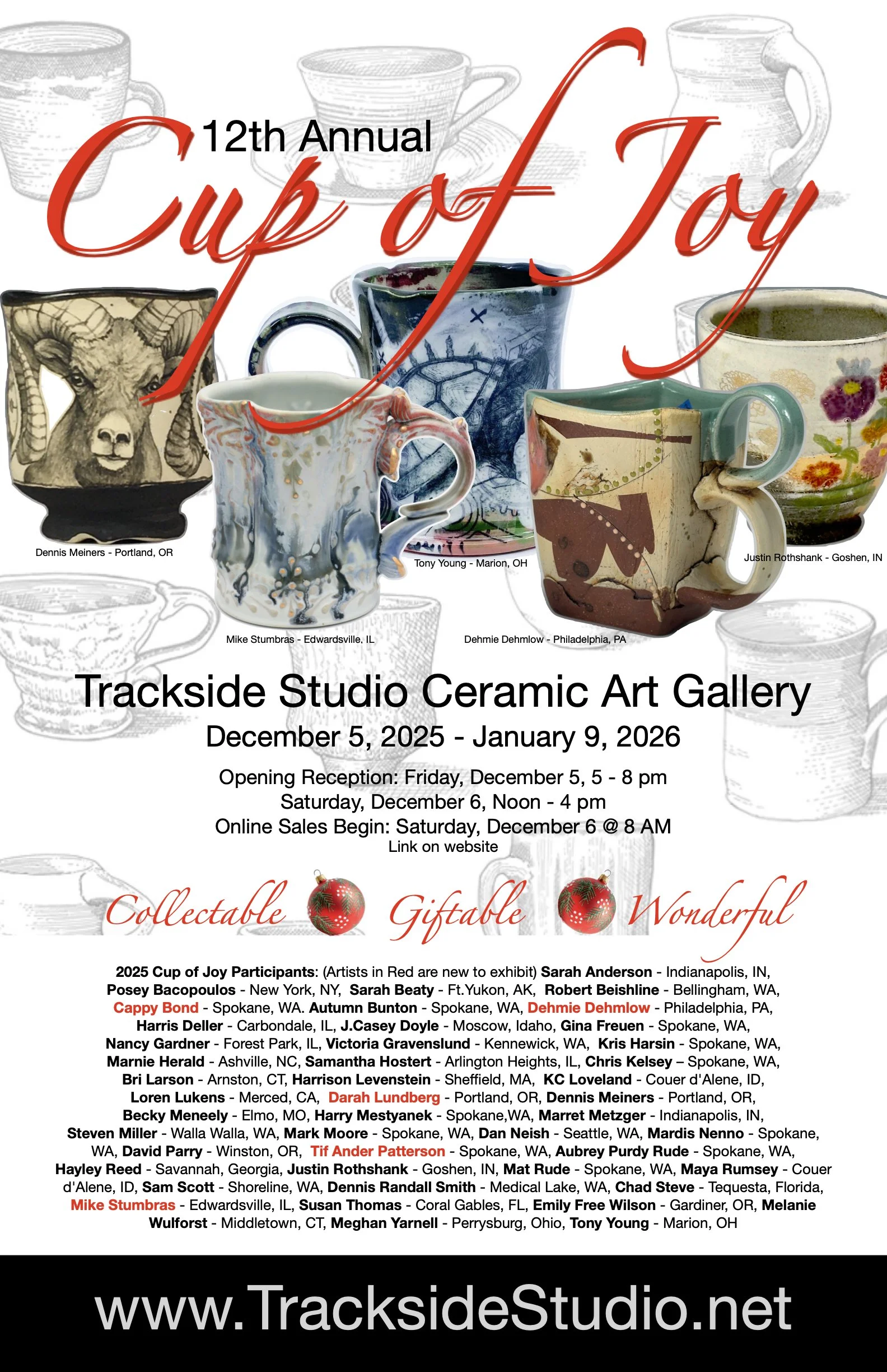 National Invitational, exhibition and sale of over 200 ceramic cups and over 50 artists. This exhibit features ceramic cups in many forms, colors and treatments, collectable, usually functional and most truly giftable for your holiday season. Participating artists are local friends and artists here in Spokane and then over 3 dozen professionals invited from all four corners of the United States.